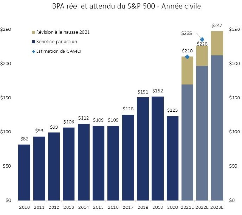 Avec l’épargne élevée des ménages et le ralentissement prévu des cas de COVID-19, nous prévoyons que la croissance économique demeurera solide au cours du premier semestre de l’année. Cela signifie que les sociétés embaucheront et que les salaires augmenteront, ce qui renforcera la confiance des consommateurs et les bénéfices des entreprises. Après deux années consécutives de relance de la masse monétaire et de taux d’intérêt quasi nuls à l’échelle mondiale, les bénéfices se sont rapidement redressés depuis 2020 et ont même dépassé ceux de 2019. Nous prévoyons que les 500 plus grandes sociétés des États-Unis, telles que suivies par l’indice S&P 500, auront un bénéfice moyen par action de 235 $ en 2022.