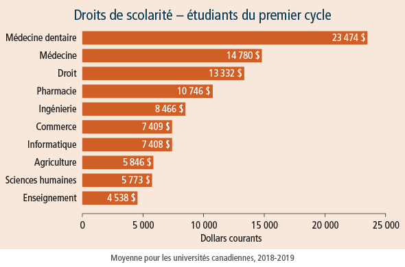 Si un parent se base sur la moyenne des frais de scolarité pour estimer le montant dont il aura besoin pour l’épargne-études, il devra mettre de côté 6 838 $ pour chaque année scolaire, selon la moyenne des frais de scolarité de 2018-2019 pour les universités canadiennes.1 Et si l’enfant choisit de faire des études en médecine dentaire ? Les frais de scolarité annuels moyens pour les programmes en médecine dentaire au Canada sont de 23 474 $.1